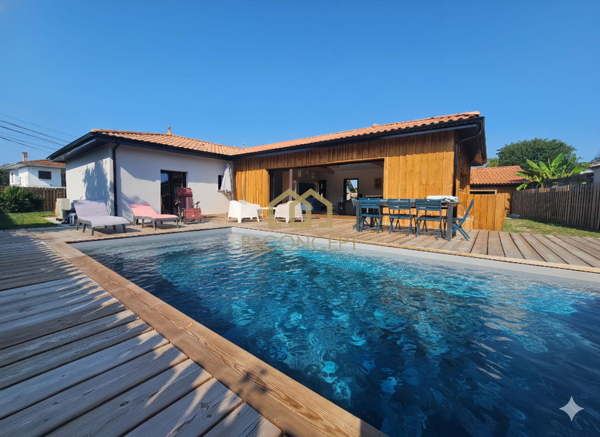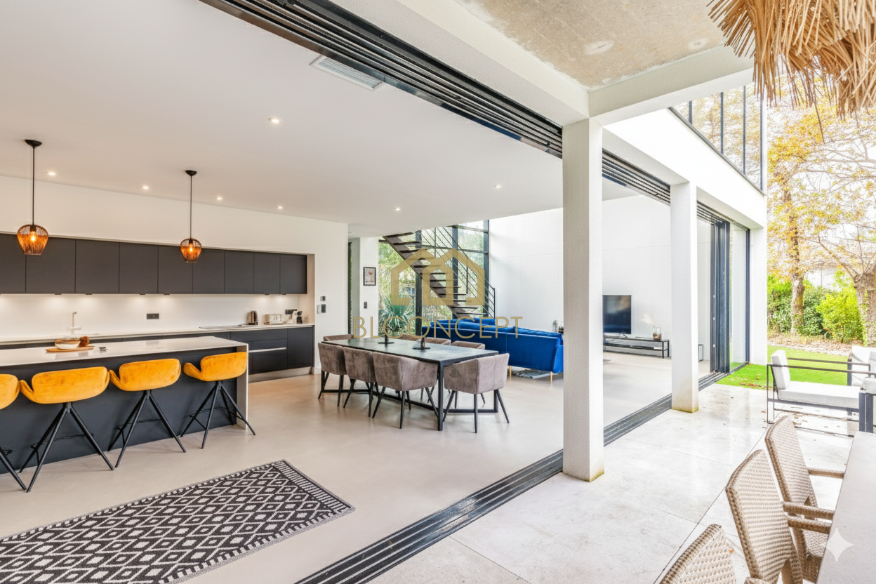 Elle se compose d'un double salon salle à manger avec cuisine aménagée et équipée avec insert, 4 chambres dont 3 suites parentales avec salle d'eau et dressing, 2 wc, arrière cuisine, terrasse de 72m2.
