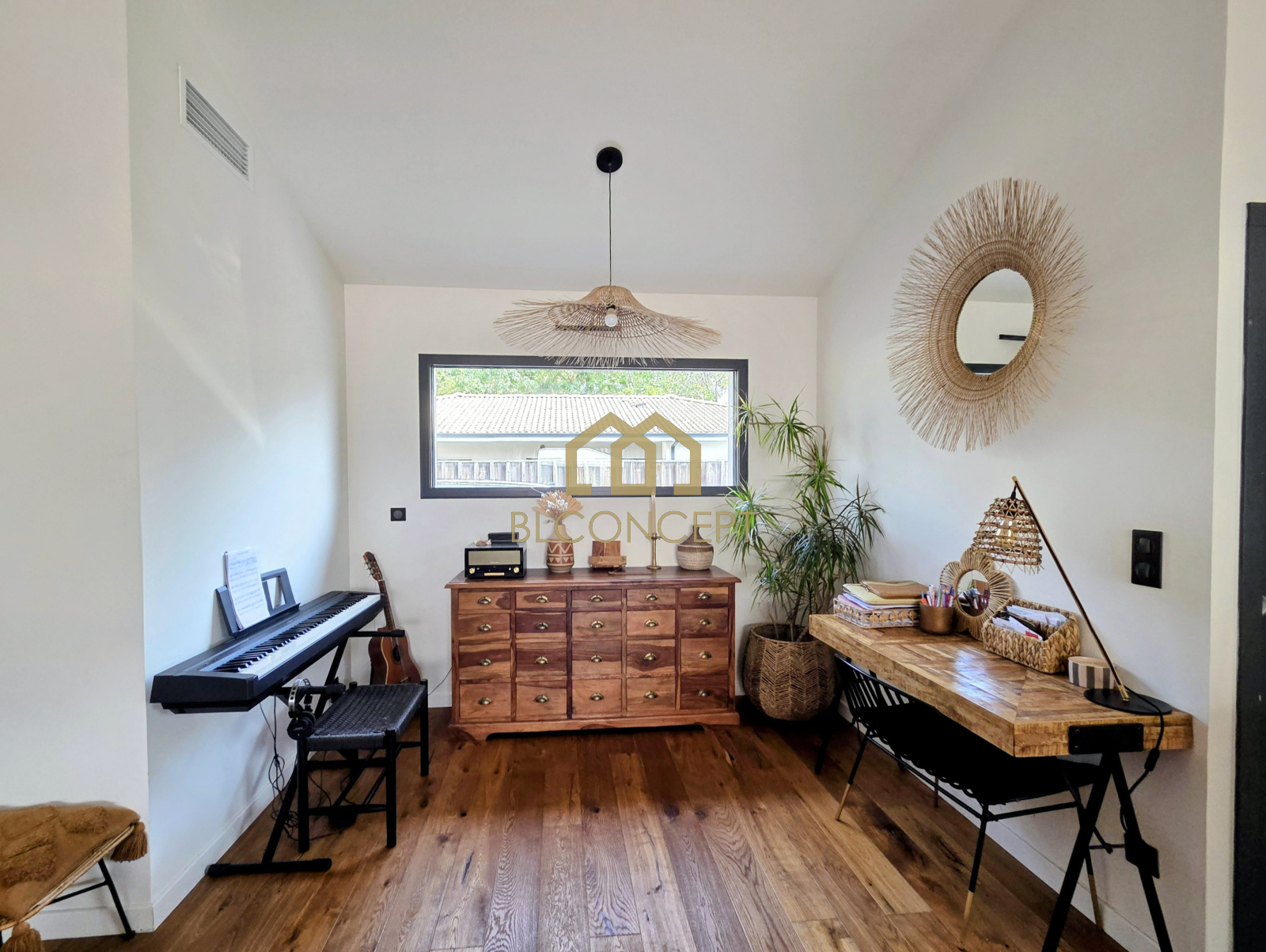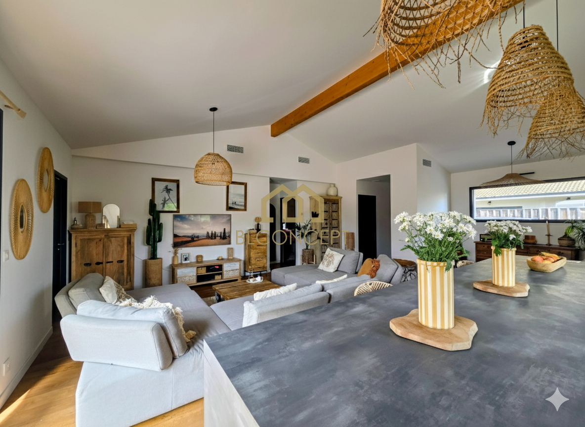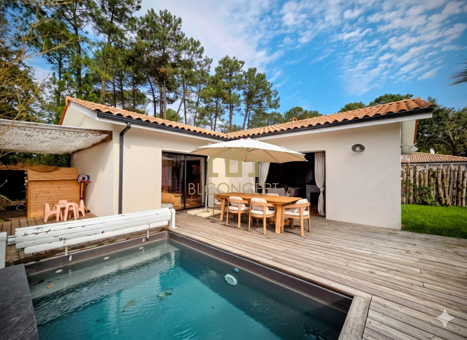 Emilie DIEGO (06 64 45 10 82) agence BL Concept vous propose à Cazaux cette charmante villa de plain pied. Construite en 2019, elle se compose d'une entrée avec rangement, d'une pièce de vie lumineuse avec une belle hauteur sous plafond, des baies à galandage donnant sur la piscine, une cuisine US aménagée et équipée, 2 chambres, une salle de bains, une suite parentale avec salle d'eau et dressing, un cellier.