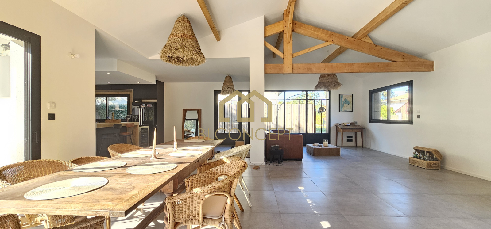 Réalisé avec des matériaux de qualité, ce bien offre une très belle pièce de vie de 90 m² proposant de belles hauteurs sous plafond grace à son plafond cathédrale faisant apparaitre la charpente traditionnelle.