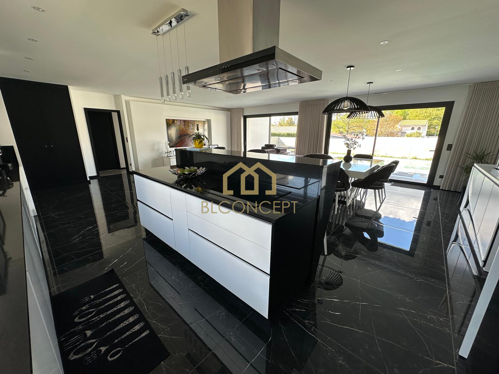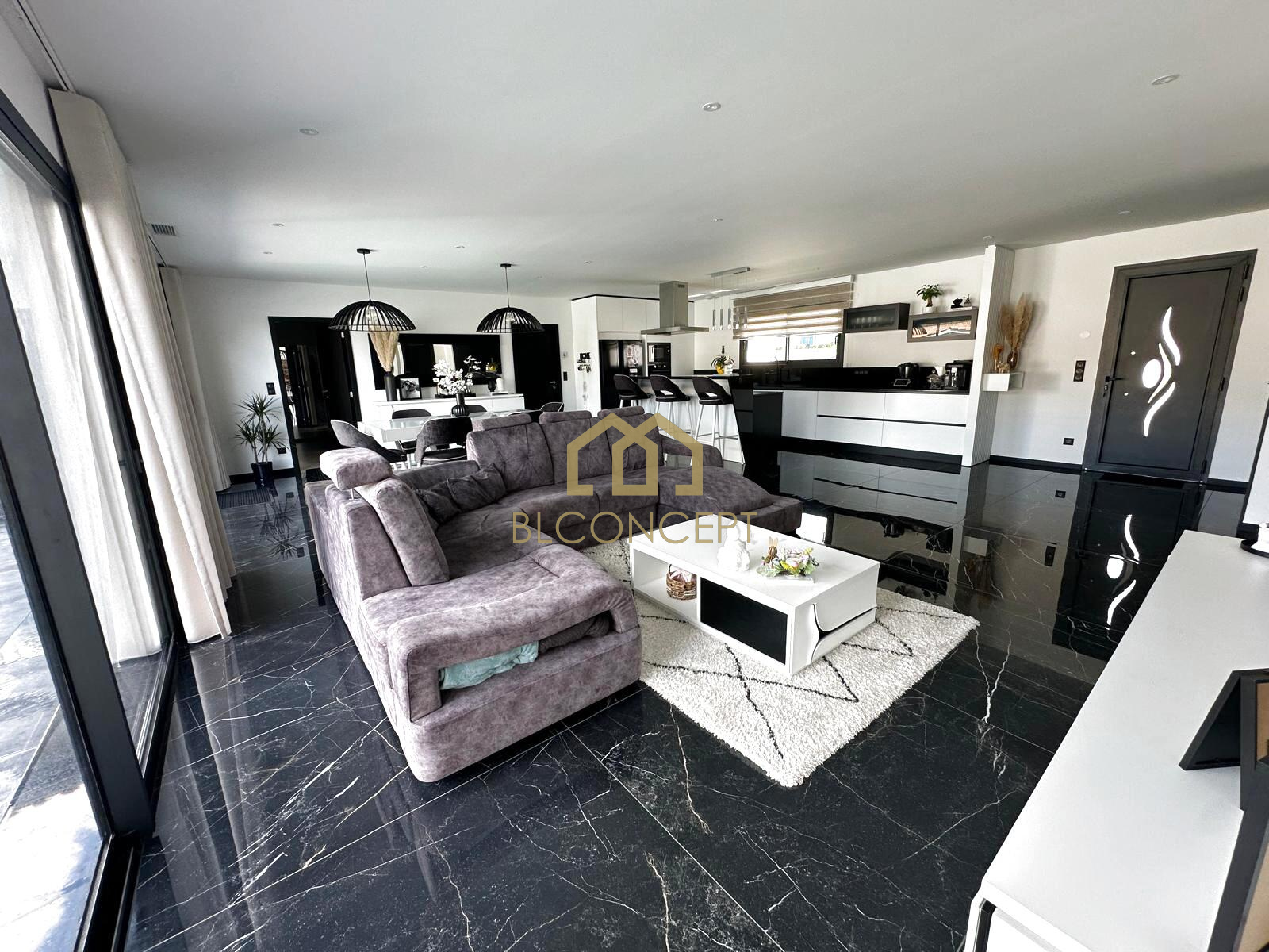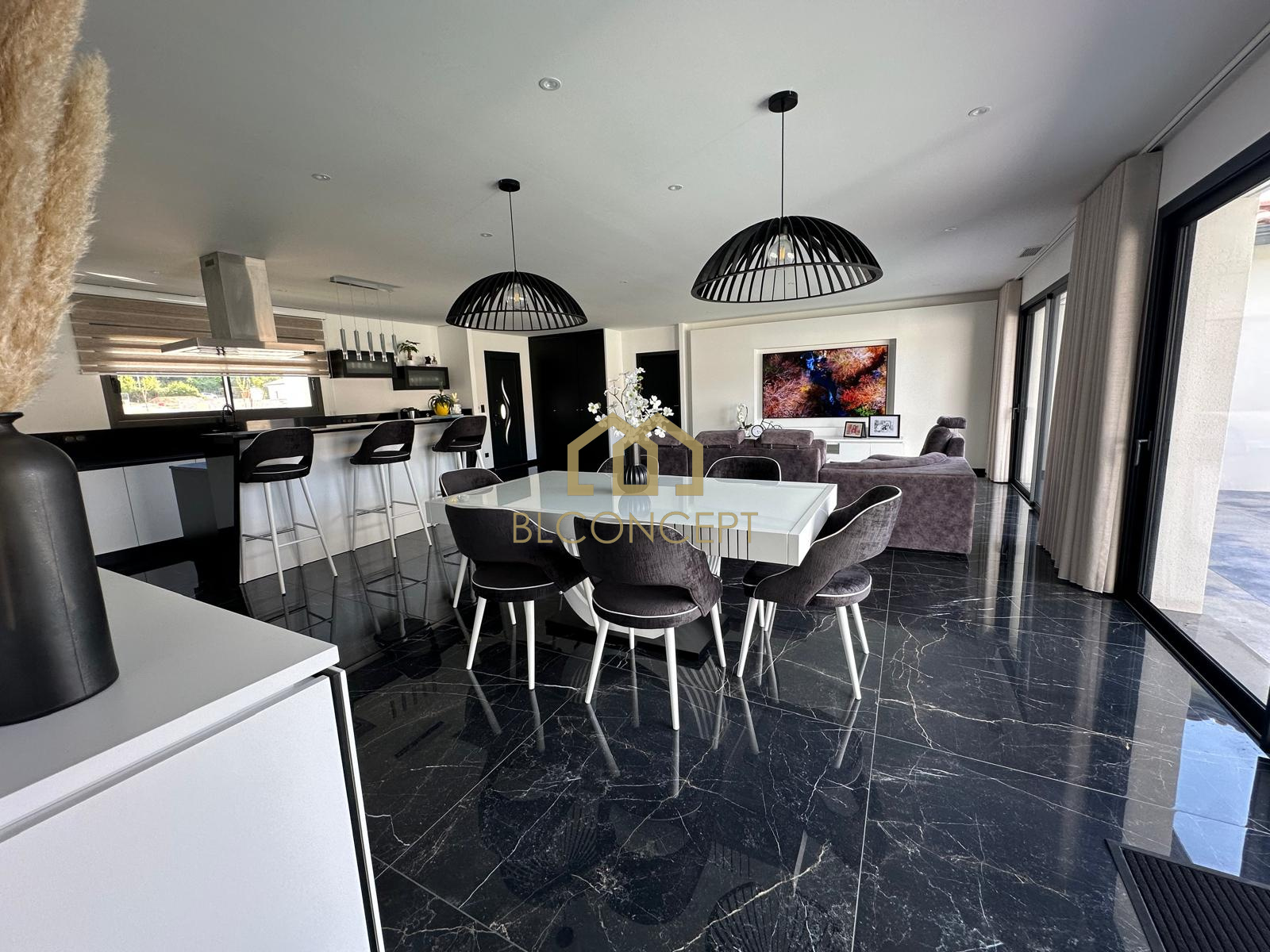 Cette charmante villa de plain pied construite en 2024 de 145 m2. Elle se compose d'une vaste entrée avec placard, une pièce à vivre traversante et lumineuse d'environ 70 m2, une cuisine aménagée et équipée plan de travail noir d'angola, arrière cuisine/ buanderie avec accès sur l'exterieur, garage carrelé et isolé..